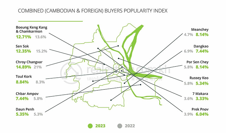 Within the capital, combining interest from Cambodians and foreigners in the recent survey on property preferences, the three areas most in demand to buy property in at the start of 2023 were: